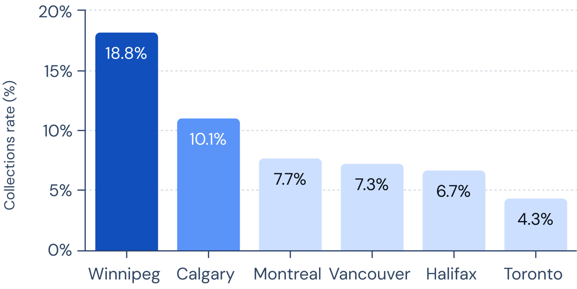 Third - Looking deeper at debt in Canada’s major cities, Winnipeg (Alberta) has nearly 1 in 5 tenants have accounts in collections and the highest bankruptcy rates in comparison to others.